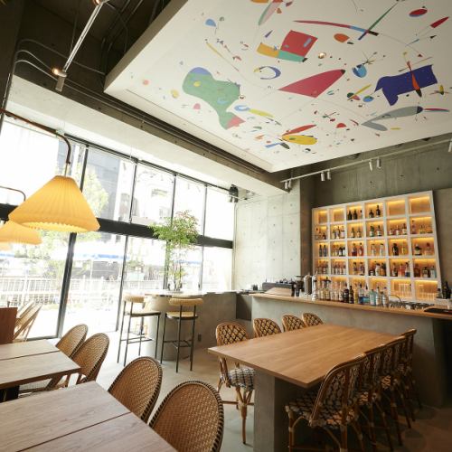 暗めの間接照明がお洒落で、観葉植物の緑が居心地の良さをプラス。そんなシックで落ち着いた雰囲気のもと、食事の時間を満喫いただけます。統一されたこだわりのインテリアと、天井で目を引くインパクトがある「渋田薫」さんのアート作品もお楽しみポイントの一つです。